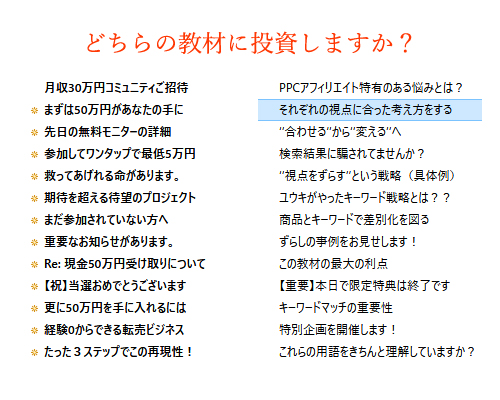 あなたなら、どちらのメルマガを読みたいと思いますか? どちらの発行者が販売している教材を買おうと思いますか?