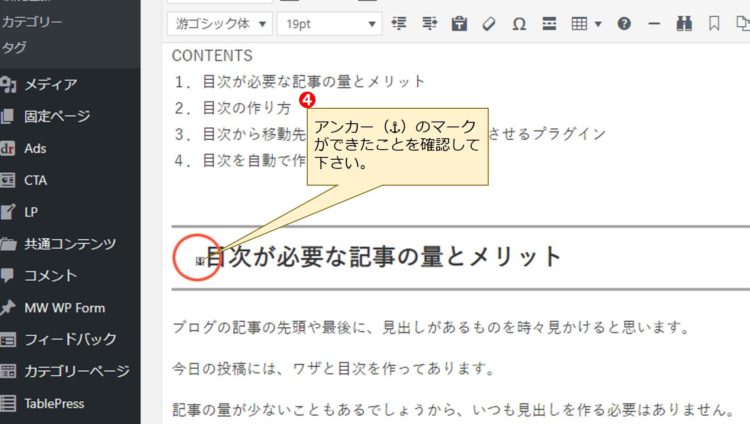 以上の操作で、目次をクリックすれば、アンカーを設定した文章へ移動するリンクの設定できました。