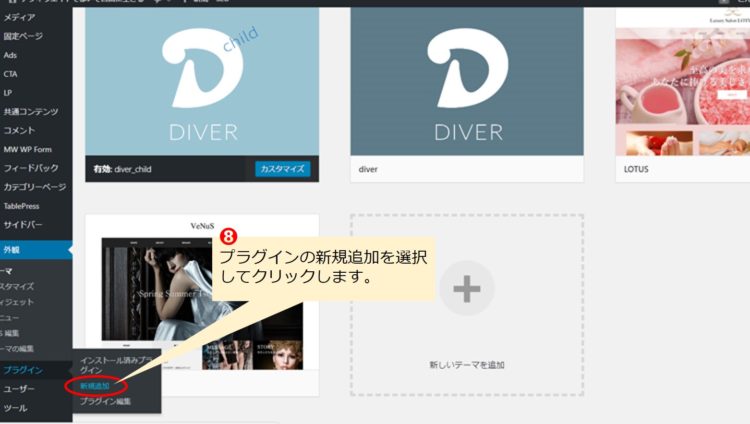 1.ダッシュ―ボードの項目から、プラグイン→新規追加を選択します。