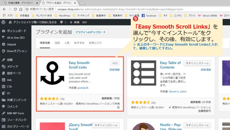 2.右上の検索窓に「Easy Smooth Scroll Links」と入れて検索すれば、下図のように表示されます。”今すぐインストール"をクリックしてインストールし、有効化します。これだけでOKです。